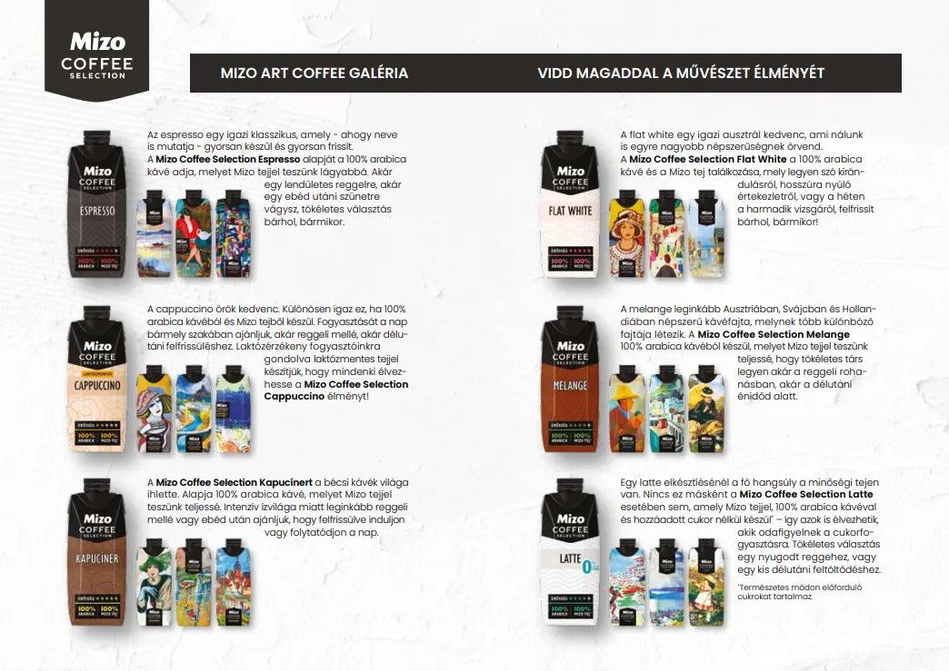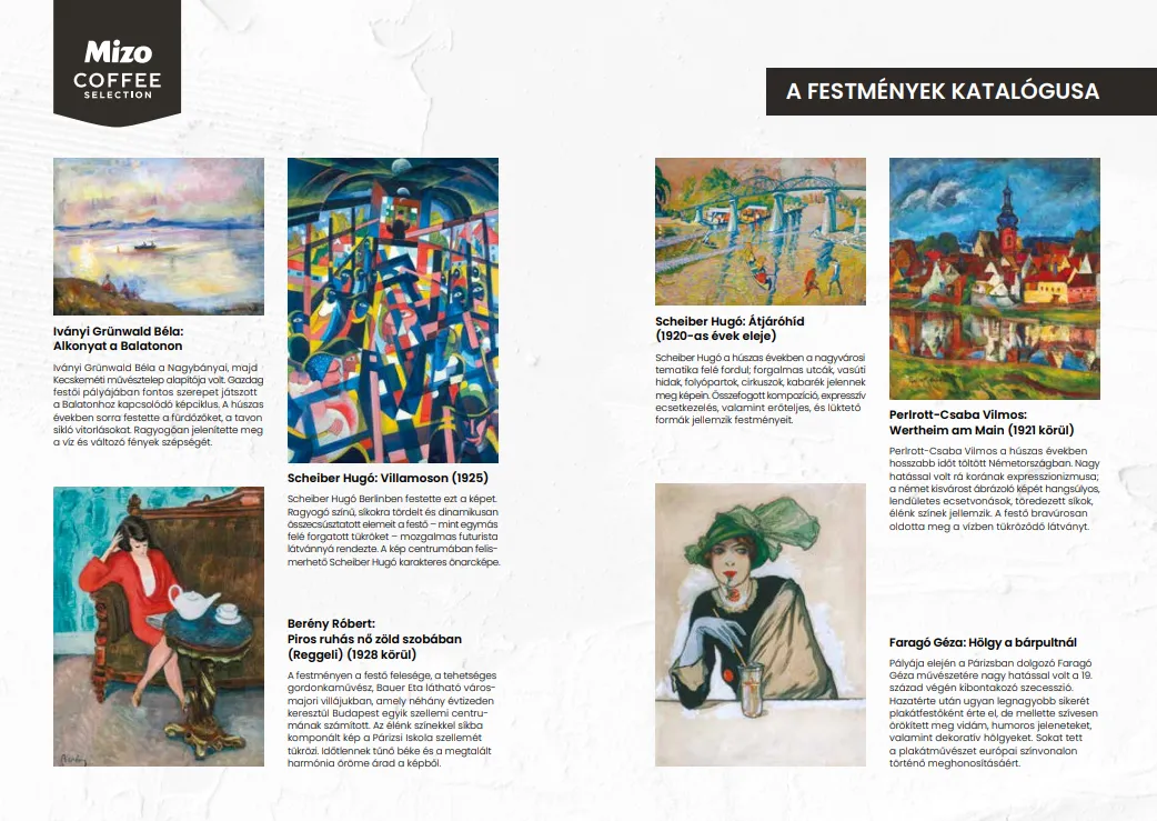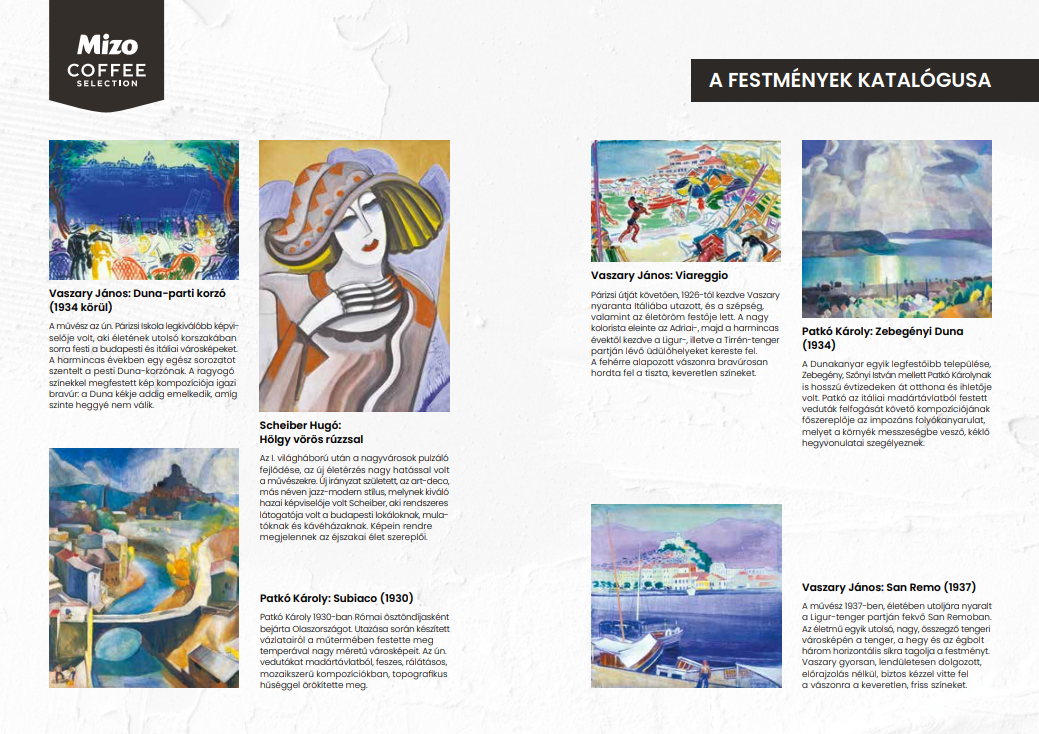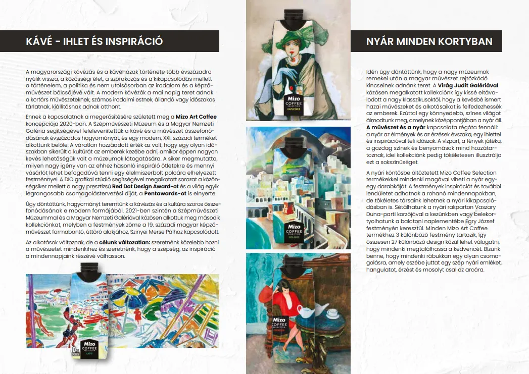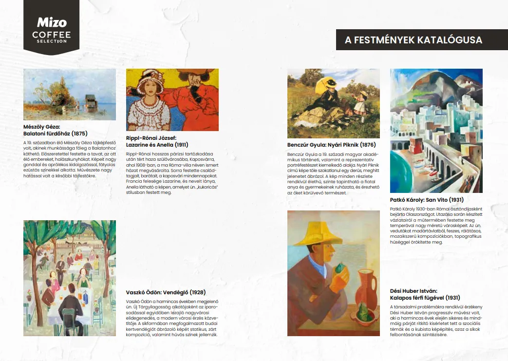 A korábbi Mizo Art Coffee kampányok népszerűségére építve ismét egyesítjük a művészet és a kávézás élményét a Mizo Coffee Selection termékcsalád új, limitált kollekciójában. A Virág Judit Galériával közösen megálmodott kollekció fókuszában ezúttal a magyar művészet rejtett kincsei állnak: idén a nagyközönség számára kevésbé ismert, ám kiemelkedő művészek festményei elevenednek meg a dobozokon, egy színes, nyári hangulatot idéző válogatásban. Célunk változatlan: közelebb hozni a művészetet mindenkihez és becsempészni a szépséget és az inspirációt a mindennapokba.