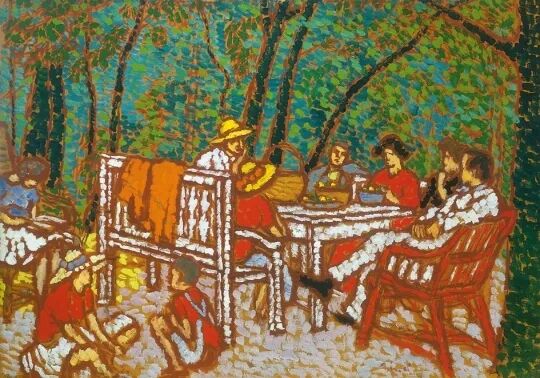 A kép a művész kaposvári otthonában, az impozáns Róma-villa kertjében készült, amelyet 1908-ban vásárolt meg. A bensőséges, a művész családját ábrázoló kép ún. „kukoricás” stílusban készült; a ragyogó, keveretlen színekből álló festékpöttyökkel való ábrázolás teljesen egyedülálló a festészet történetében.