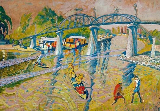 Scheiber Hugó a húszas években a nagyvárosi tematika felé fordul; forgalmas utcák, vasúti hidak, folyópartok, cirkuszok, kabarék jelennek meg képein. Összefogott kompozíció, expresszív ecsetkezelés, valamint erőteljes, és lüktető formák jellemzik festményeit.