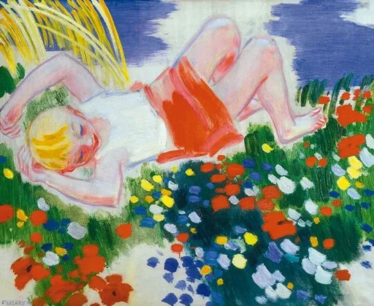 Vaszary, mint oly sok számára fontos témát, a gyermeki önfeledtséget, a fűben heverő kislány motívumát többször is megfestette. A kép a természetben létező ember alapvető élményét ragadja meg. A rálátásos kompozíció, a harsogó színpászmákkal ábrázolt tavaszi mező, valamint az alóla kiragyogó, üresen hagyott fehér vászon együttese igazi bravúr.
