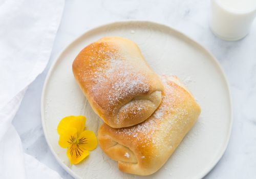 Dissolve the yeast in lukewarm sugary milk. Knead it together with the other ingredients into a soft dough by gradually adding milk. Let it rise covered for approx. 1/2 hour in a warm place, then stretch the dough into a rectangle shape and cut into 12 equal squares.