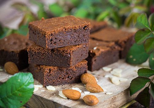 Melt dark chocolate with butter and cream over steam. Beat the eggs with the two types of sugar into a foam, then add the chocolate mass, almonds and the other ingredients. Pour into a greased cake tin, sprinkled with cocoa powder and bake for approx. 45 minutes. Let it cool and serve sliced.