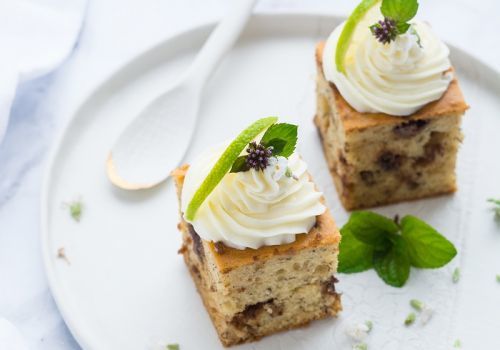 Mix the ingredients for the cream, fill them into a decorating bag and decorate the top of each cake with mint and thinly sliced lime rings.