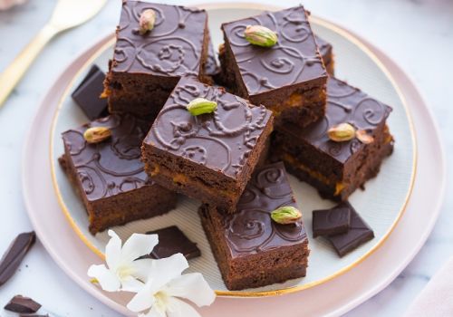 Melt the butter and dark chocolate over steam, pour on top of the cake and leave to freeze in a cool place. Serve cut into cubes, decorated with whipped cream or pistachios.