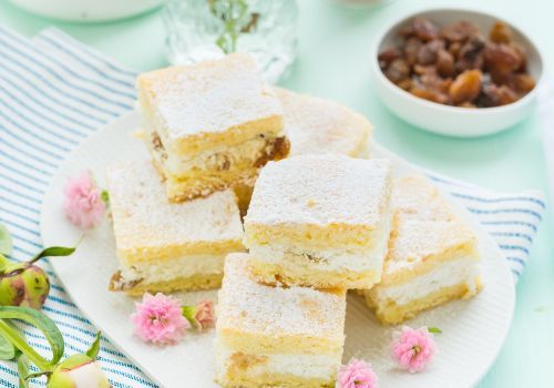 Soak the raisins in a little water, beat the egg whites into a hard foam. Mix the smashed cottage cheese with the two types of sugar and the squeezed raisins, whisk them on the egg white foam.